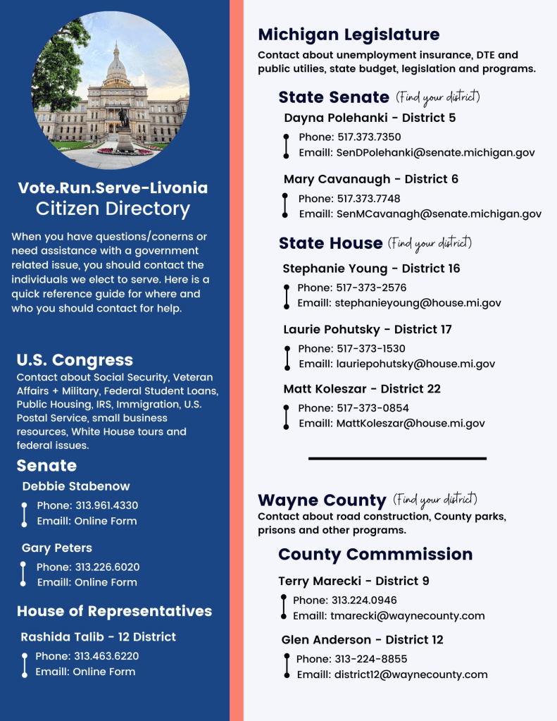 It’s a new year and Livonia has new representation! Here’s a go-to guide for who to contact when you have concerns about a government issue. Use the graphics below or reference the digital directory for live links to representatives websites.