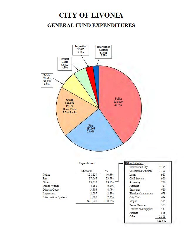 Livonia’s budget is slightly unique because it has many special revenue funds that restrict the use of dollars to specific areas. There are 21 Special Revenue Funds. A few of note are Roads, Community Recreation, Refuse, Library and Community Transit. Items of note in this area: