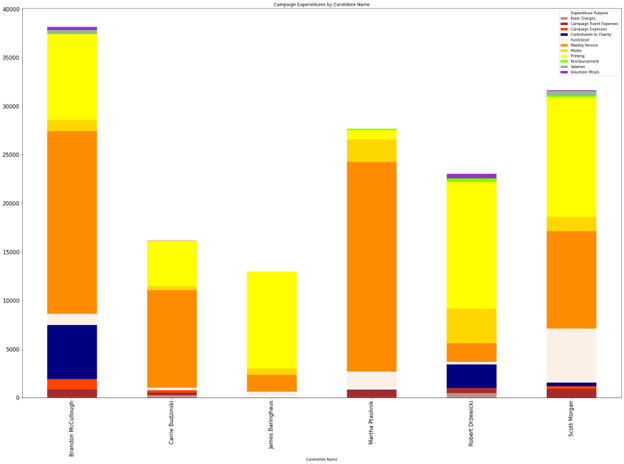 Livonia’s council candidates made good use of their campaign contributions. In total, council candidates spent nearly 150k on campaign related expenditures. The graphic below shows a condensed version of all candidate campaign expenditures. The expenditures below have been consolidated from over 60 different types of expenses. Vote.Run.Serve grouped similar expenses into single categories to simplify the graphic below. Candidate expenses like candidate clothing and professional dues membership were grouped into one category – campaign expenses. Similarly, online transaction fees and account charges were grouped into another single category – bank charges.